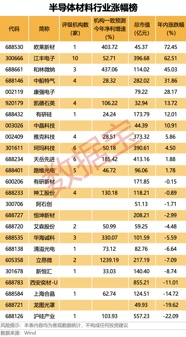 据证券时报·数据宝统计,A股市场上半导体材料行业共有25股。其中,机构一致预测立昂微2026年净利增速超12倍居首。